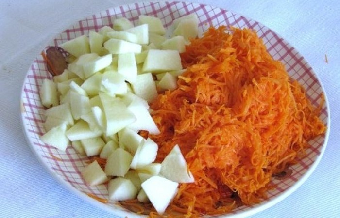 2Яблоки нарезаем небольшими кубиками (несколько ломтиков оставляем для украшения), а тыкву трем на средней терке.