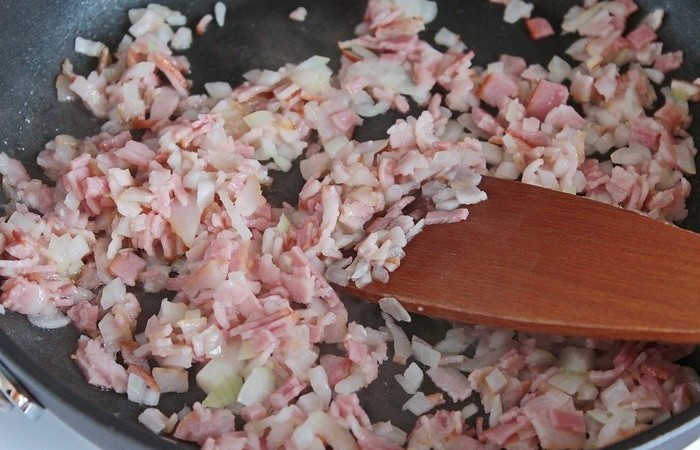 4Грудинку и лук нарезаем мелкими кубиками. Обжариваем в течение 3-4 минут, периодически помешивая.
