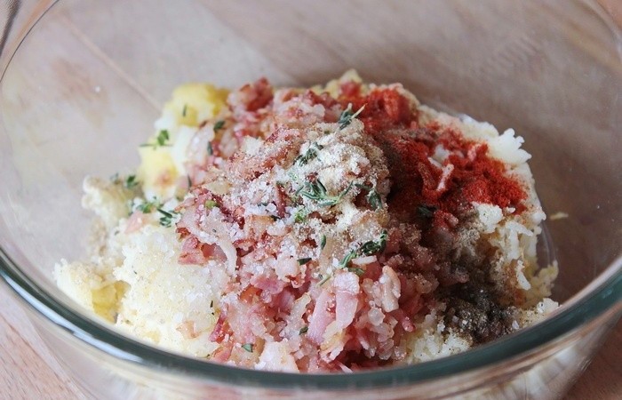 5В емкости смешиваем картофель, обжаренную грудинку с луком, яблоко, пропущенный через пресс чеснок. Добавляем яйцо, муку, тимьян, паприку, соль и перец.
