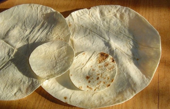 6Из лаваша вырезаем 2 больших круга, а два маленьких по размеру формочек.