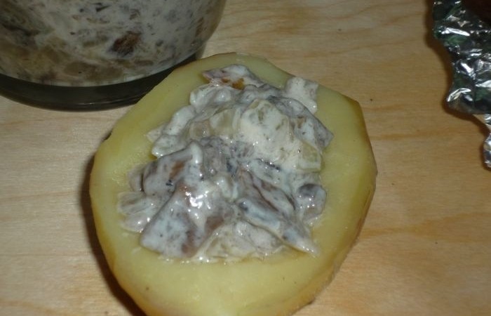 6Грибную начинку смешиваем со сметаной и заполняем ею картофель.