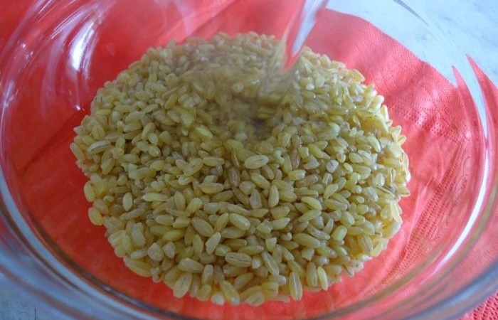 2Булгур заливаем кипятком и оставляем в покое на 10 минут для набухания.