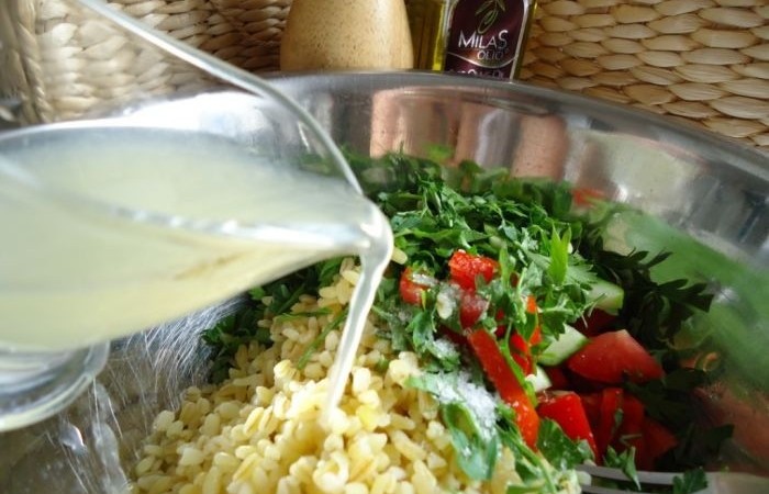 5В миске смешиваем рубленую петрушку, нарезанный колечками лук и мелко нарезанные помидоры с огурцом. Добавляем остывший булгур и поливаем заправкой. Солим, перчим.