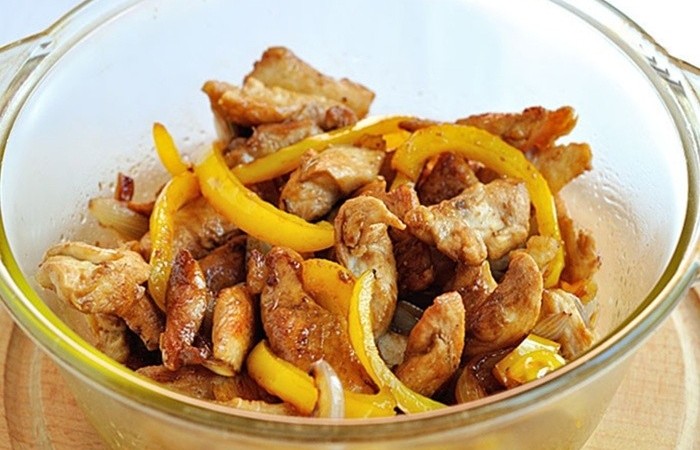 3Перец нарезаем тонкой соломкой и обжариваем в течение 3-4 минут на той же сковороде, где готовилась курица.