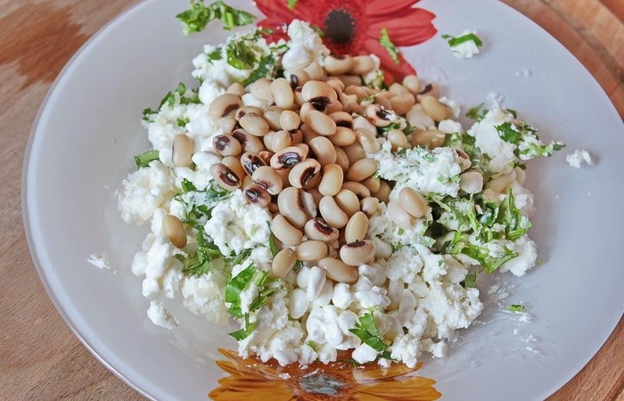 5На тарелке смешиваем фасоль, брынзу, кинзу и чеснок. Поливаем маслом, солим, добавляем цедру лимона и паприку. Перемешиваем и подаем к столу. Приятного аппетита!