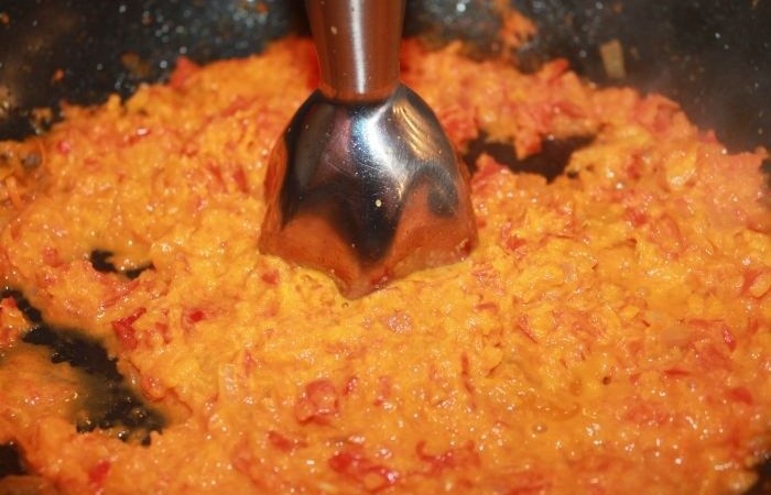 4Лук мелко нарезаем, а морковь трем на крупной терке. Обжариваем в течение нескольких минут, а затем добавляем мелко нарезанный помидор и тушим еще 5 минут. Добавляем запеченный перец, нарезанный кубиками. Измельчаем все ингредиенты с помощью блендера.