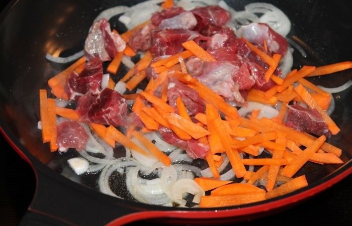 2Лук режем полукольцами, а морковь брусочками. Обжариваем в течение нескольких минут и добавляем нарезанную кубиками говядину. Продолжаем обжаривать до золотистого цвета мяса.