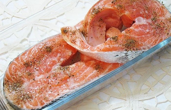 2Стейк солим, перчим и поливаем лимонным соком. Оставляем рыбу в покое на 30 минут.