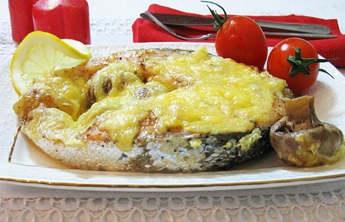 4Сыр трем на крупной терке или шинкуем брусочками с помощью овощерезки. Посыпаем рыбу с грибами сыром и отправляем в духовку на 25 минут, предварительно разогретую до 190 градусов.