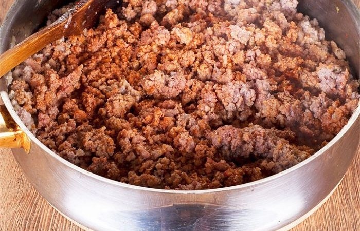 4В отдельной сковороде обжариваем до полуготовности фарш в течение нескольких минут, а затем заливаем томатной пастой и тушим до готовности фарша в течение 10 минут. Солим, перчим.