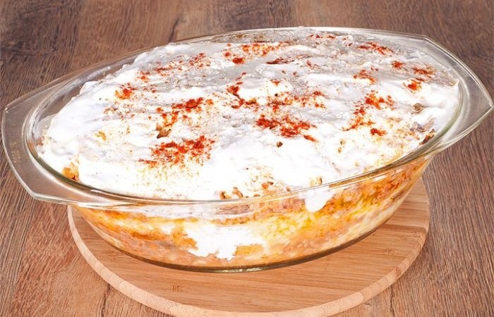 7Последним слоем кладем капусту. Сверху смазываем тщательно сметаной и посыпаем паприкой. Отправляем в духову на 25 минут, предварительно разогретую до 170 градусов.