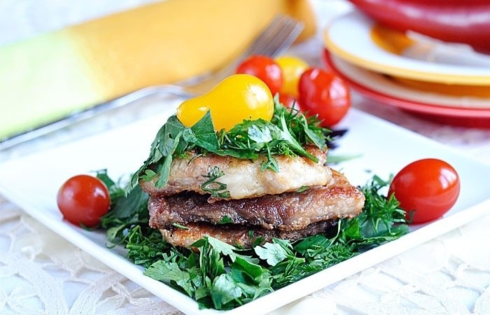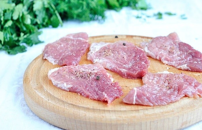 3Отбиваем каждый кусочек мяса под пищевой пленкой. Солим, перчим со всех сторон и обжариваем до румяной золотистой корочки.
