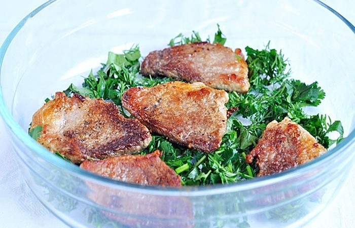 4Тем временем промываем и обсушиваем зелень и выкладываем в миску. Сверху выкладываем кусочки мяса и накрываем емкость. Оставляем на 15 минут, чтобы мясо пропиталось.