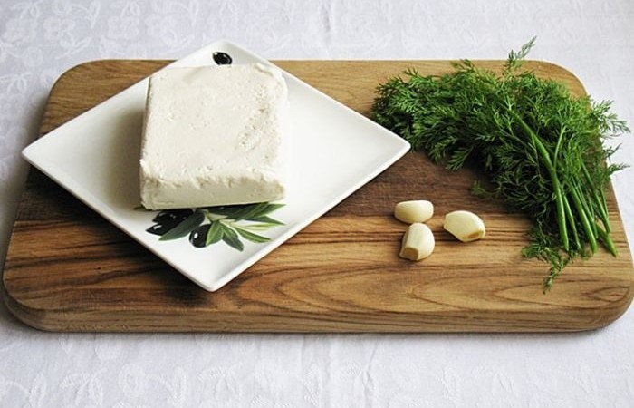 2Готовим крем. Чеснок с укропом мелко нарезаем и смешиваем с творогом. Солим и заправляем майонезом.