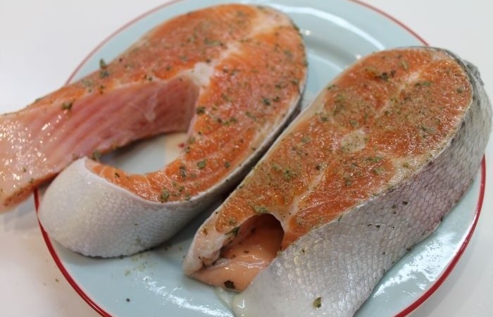 2Форель натираем со всех сторон специями и оставляем мариноваться на 15 минут.