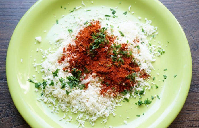 3В тарелке смешиваем тертый на мелкой терке сыр, рубленую зелень и паприку. Солим, перчим и все тщательно перемешиваем.