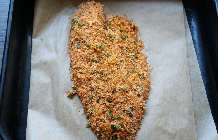 5Обваливаем филе в сырной панировке и выкладываем на противень, застеленный пергаментом. Отправляем в духовку на 12-15 минут, предварительно разогретую до 180 градусов.