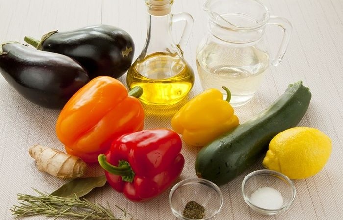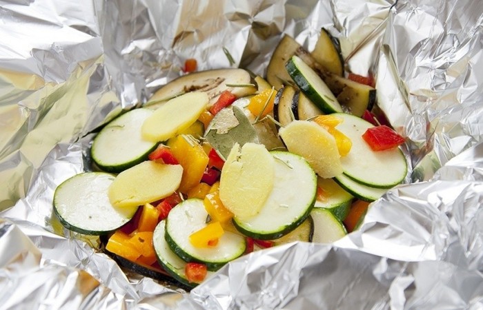 3Из фольги делаем 4 квадратика. Нарезанные овощи раскладываем по квадратикам и формируем конвертики. В отдельной миске смешиваем оливковое масло, лимонный сок, вермут, соль и перец. Поливаем овощи заправкой, добавляем розмарин с лавровым листом и отправляем в духовку запекаться при 180 градусах.