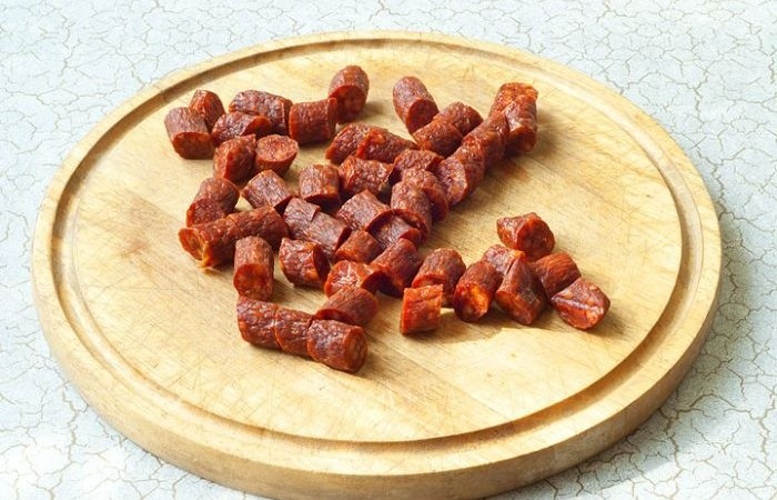 3Колбаски нарезаем небольшими колечками. Добавляем к овощам и тушим еще 7-8 минут.