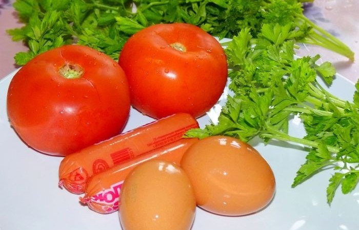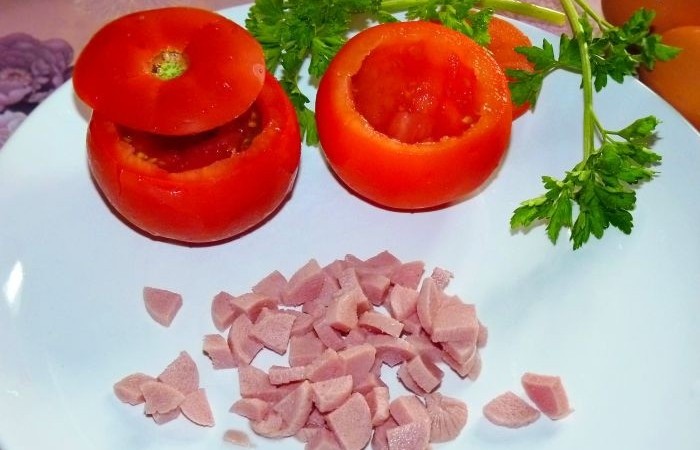 2С помидор срезаем верхушку и достаем мякоть. Сосиску нарезаем мелкими кубиками.