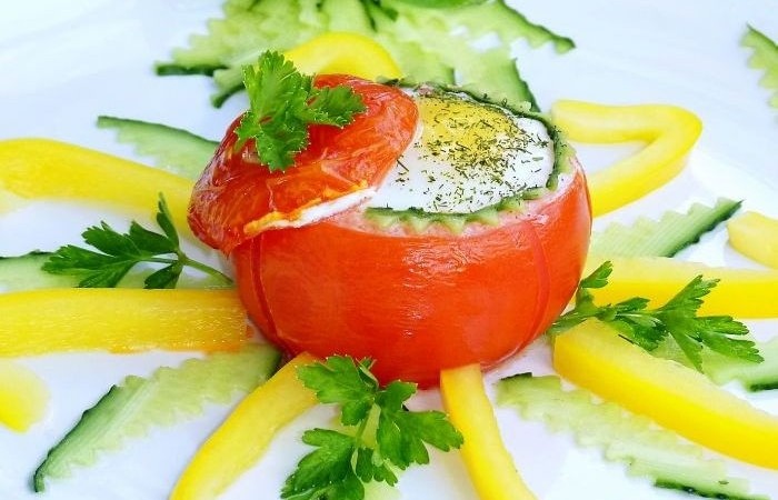 Яичница - любимое многими блюдо, приготовление которого совсем примитивное и не занимает много времени. Здесь представлен довольной необычный яркий вариант яичницы в помидорах, которая запекается в духовке.