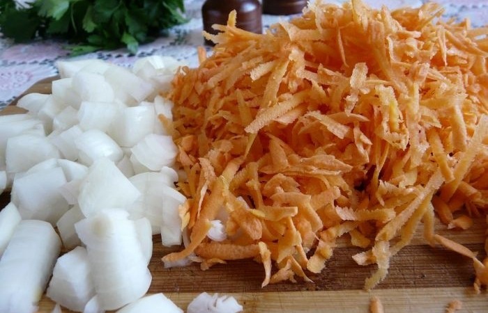 3Тем временем лук нарезаем небольшими кубиками, а морковь трем на крупной терке.