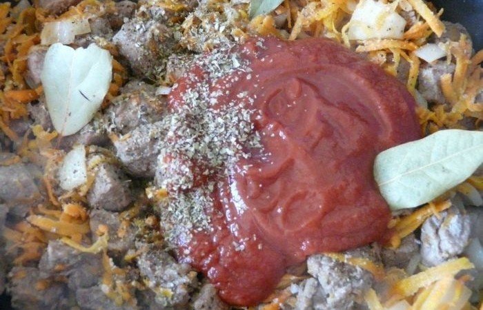 4К мясу добавляем овощи, томатную пасту, лавровый лист, а также щепотку соли и перца. Вливаем воду, тщательно все перемешиваем и тушим на среднем огне в течение 10-12 минут.