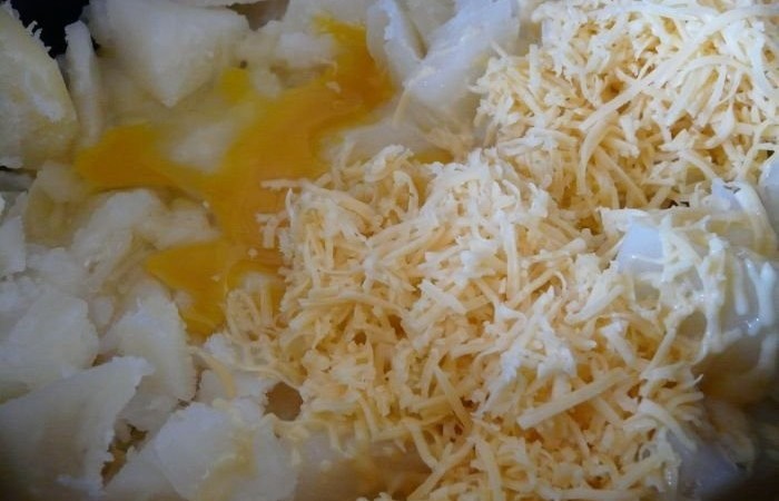 5Тем временем отвариваем картофель, разминаем его и добавляем тертый сыр, молоко и яйцо. Солим, перчим и взбиваем все с помощью миксера в пышную пену.