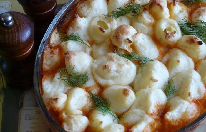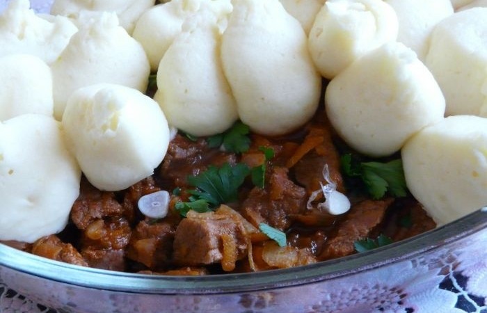 6В форму для запекания выкладываем мясо, затем кладем нарезанный пластинами чеснок и рубленую петрушку. Взбитое пюре кладем в пакет и через дырочку формируем небольшие бомбочки. Отправляем в духовку на 20 минут, предварительно разогретую до 200 градусов.