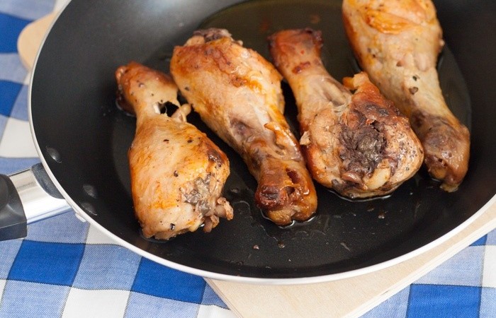6Тем временем куриные ножки промываем, обсушиваем, натираем солью со специями и обжариваем в отдельной сковороде до готовности со всех сторон.