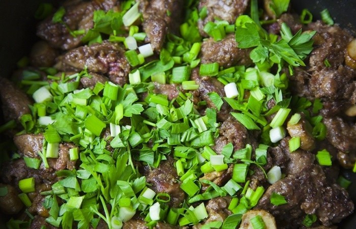 6Посыпаем рубленой зеленью, накрываем крышкой и тушим 3-4 минуты.