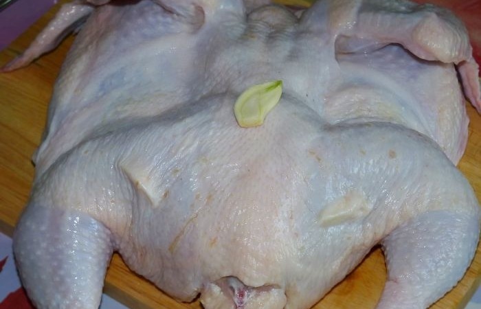 3Чеснок нарезаем пластинами и часть кладем под кожу, а часть внутрь птицы.