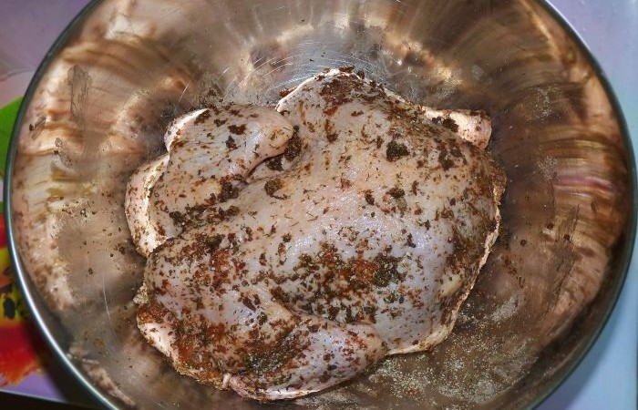 4Курицу выкладываем в емкость и тщательно обмазываем специями со всех сторон.