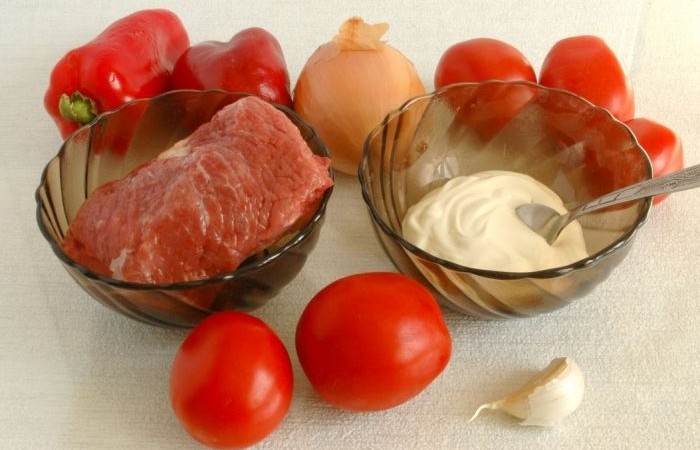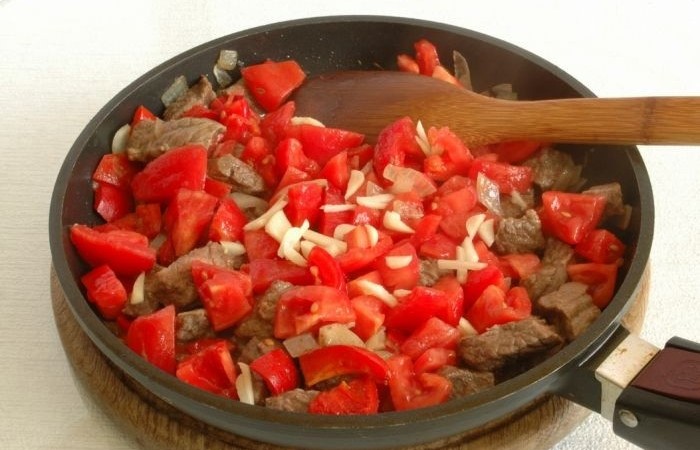 2Мясо, перец, помидоры и лук нарезаем небольшими кубиками.