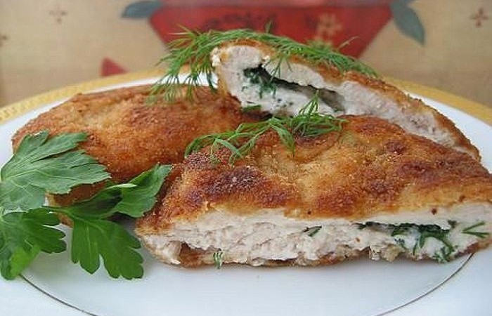1Куриное филе разрезаем вдоль и отбиваем каждый кусочек под пищевой пленкой. Отбивные солим, перчим со всех сторон, В центр кладем немного рубленого укропа и кусочек сливочного масла.