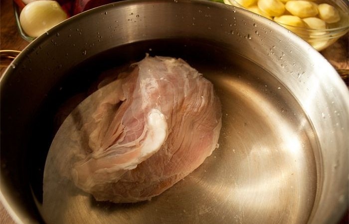 2Мясо промываем, заливаем водой и доводим до кипения. Варим на медленном огне в течение часа.