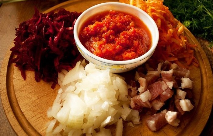 4Разогреваем сковороду и выкладываем сало, чтобы оно пустило жир. Затем добавляем лук и обжариваем в течение 3-4 минут. Затем добавляем свеклу с морковь, а также перетертые помидоры и щепотку сахара. Добавляем немного бульона из кастрюли и тушим до готовности овощей.