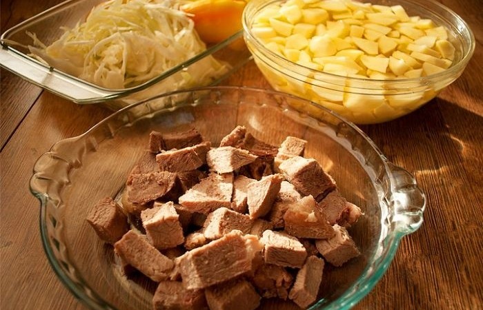 5Отварное мясо с картофелем нарезаем небольшими кубиками, капусту шинкуем, а перец нарезаем соломкой. Кладем все обратно в бульон и варим до готовности картофеля.