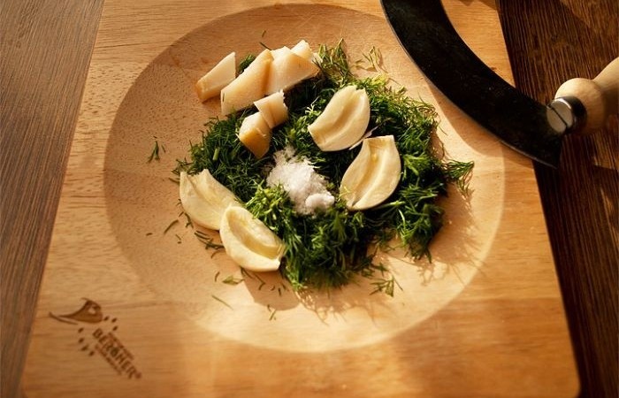 6Чеснок нарезаем дольками и удаляем сердцевину. Растираем чеснок в ступке вместе с рубленым укропом и щепоткой соли.