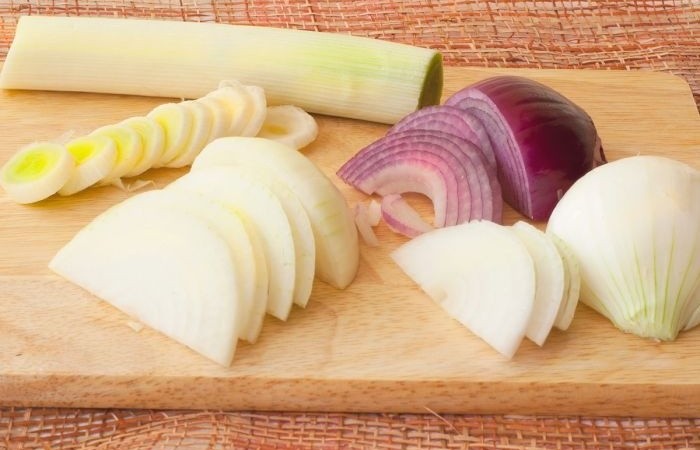 2Репчатый лук нарезаем полукольцами, а лук порей колечками.
