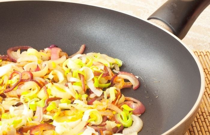 3Обжариваем все виды лука на раскаленной сковороде до мягкости в течение 7 минут, периодически помешивая.
