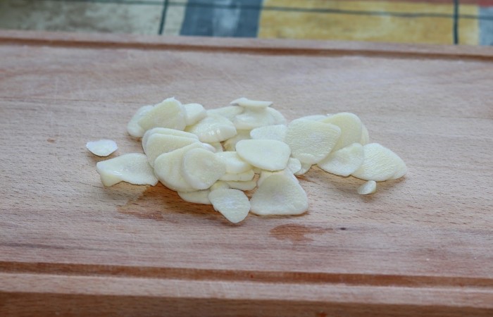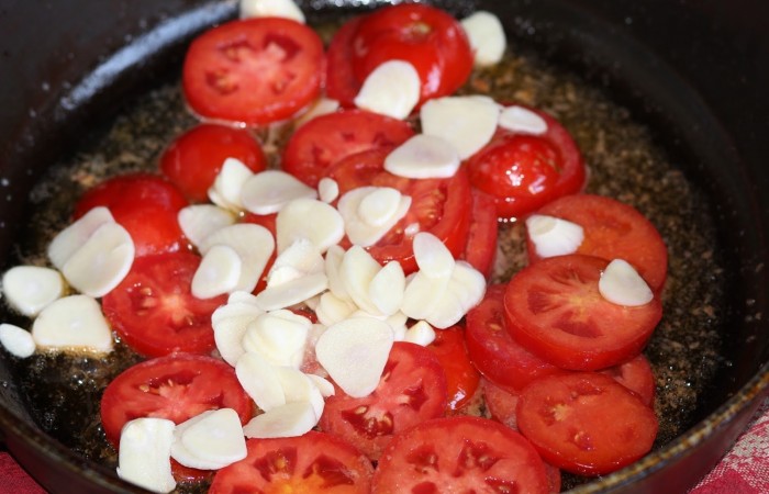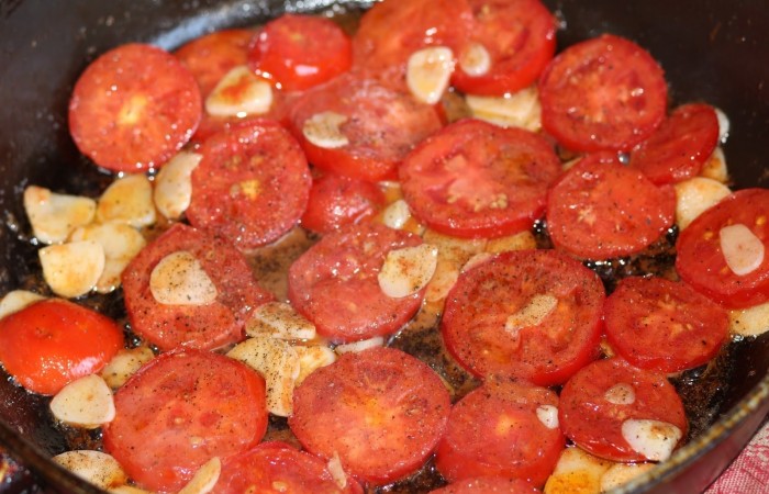 5Солим, перчим по вкусу и обжариваем в течение 3-4 минут до золотистости чеснока. Блюдо перемешиваем аккуратно, чтобы помидоры не помялись.