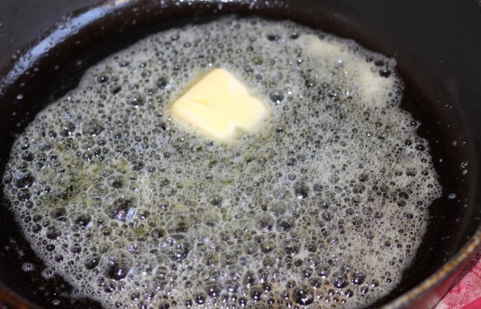 7Накрываем сковороду крышкой и жарим 3-4 минуты до готовности белка (можно жарить и дольше, если вы не любите жидкий желток).