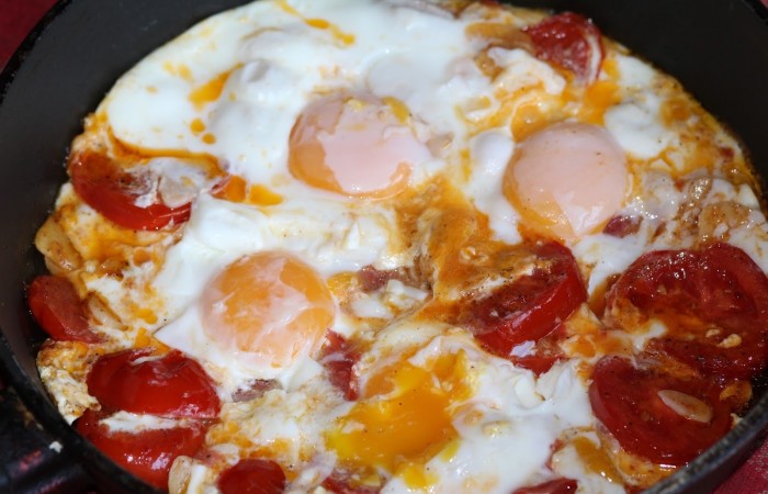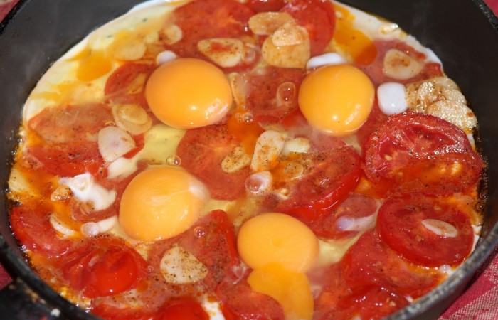 Яичница - одно из самых популярных блюд во всем мире, что ничуть неудивительно, ведь готовить ее совсем просто и быстро. Вариаций приготовления яичницы существует множество. Здесь представлена вкуснейшая пикантная яичница с помидорами в сочетании с чесноком.