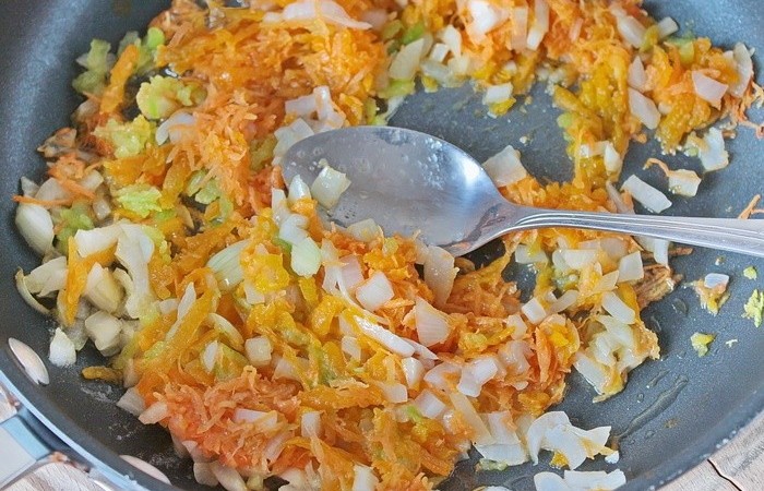 2Разогреваем сковороду, наливаем масло и выкладываем измельченный чеснок, порезанный кубиками лук и тертые на средней терке морковь с перцем. Обжариваем около 7 минут, периодически помешивая.