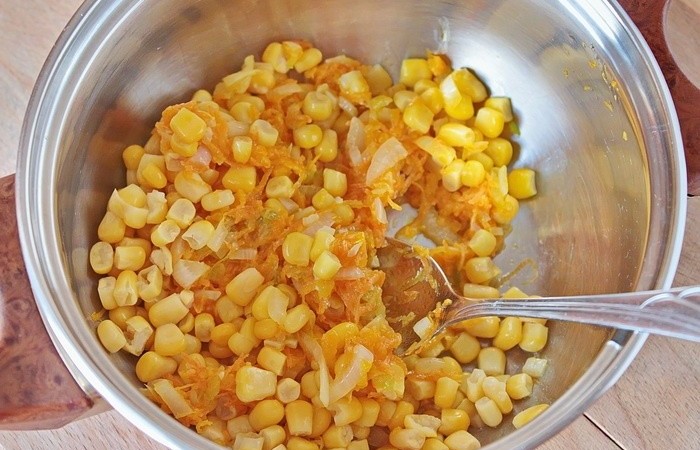 3В кастрюлю выкладываем кукурузу и пассерованные овощи.