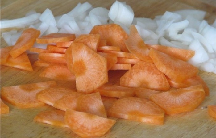 1Лук нарезаем мелкими кубиками, а морковь произвольными небольшими кусочками (можно натереть на крупной терке). Обжариваем до мягкости в течение 7-8 минут, периодически помешивая.