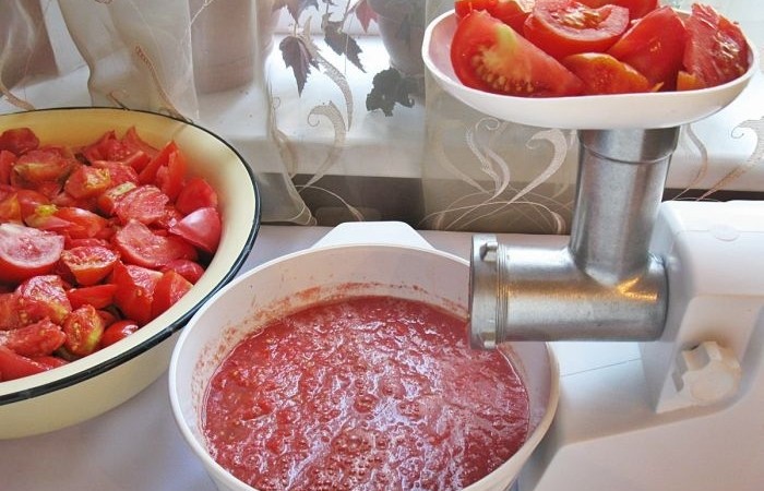 2Разрезаем помидоры на дольки и пропускаем через мясорубку. Ставим помидоры на медленный огонь, солим и варим в течение получаса.