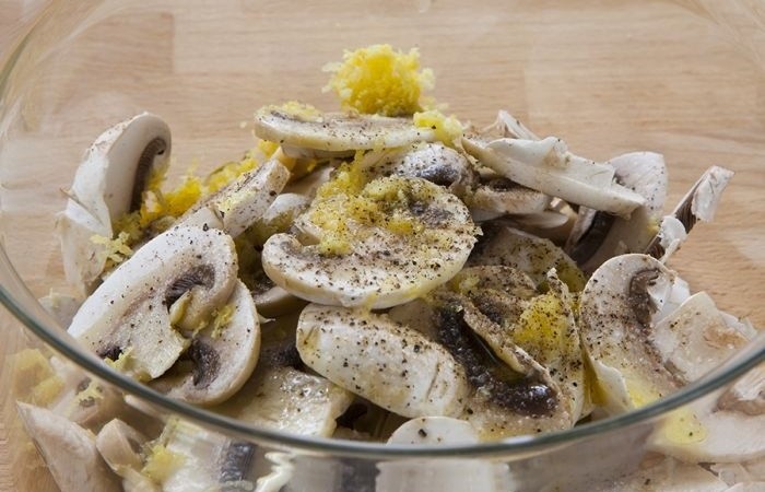 2Шампиньоны нарезаем пластинами и выкладываем в емкость. Добавляем тертую цедру лимона, лимонный сок и соль с перцем. Перемешиваем все и оставляем грибы мариноваться.