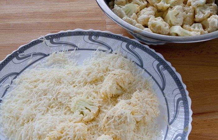 3Тем временем капусту разбираем на соцветия. Яйца взбиваем с солью и перцем. Капусту обмакиваем в яичную смесь, а затем обваливаем в тертом сыре.